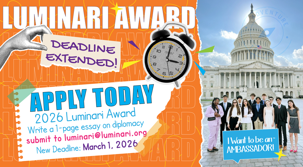 Are you a high school student in Western Pennsylvania with an interest in diplomacy, cultural awareness, global affairs, government relations or community service, then we encourage you to apply for the Luminari Award today. Our merit-based award is open to all students in 7th – 11th grades who want to hone their writing and leadership skills while competing for a scholarship to our annual diplomacy program. Winners of the competition are named Luminari Award Scholars and are invited to attend the I Want to be an Ambassador! summer camp in Pittsburgh and Washington, D.C., June 2026.
