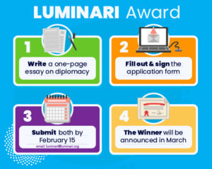 Are you a high school student in Western Pennsylvania with an interest in diplomacy, cultural awareness, global affairs, government relations or community service, then we encourage you to apply for the Luminari Award today. Our merit-based award is open to all students in 7th – 11th grades who want to hone their writing and leadership skills while competing for a scholarship to our annual diplomacy program. Winners of the competition are named Luminari Award Scholars and are invited to attend the I Want to be an Ambassador! summer camp in Pittsburgh and Washington, D.C., June 2026.